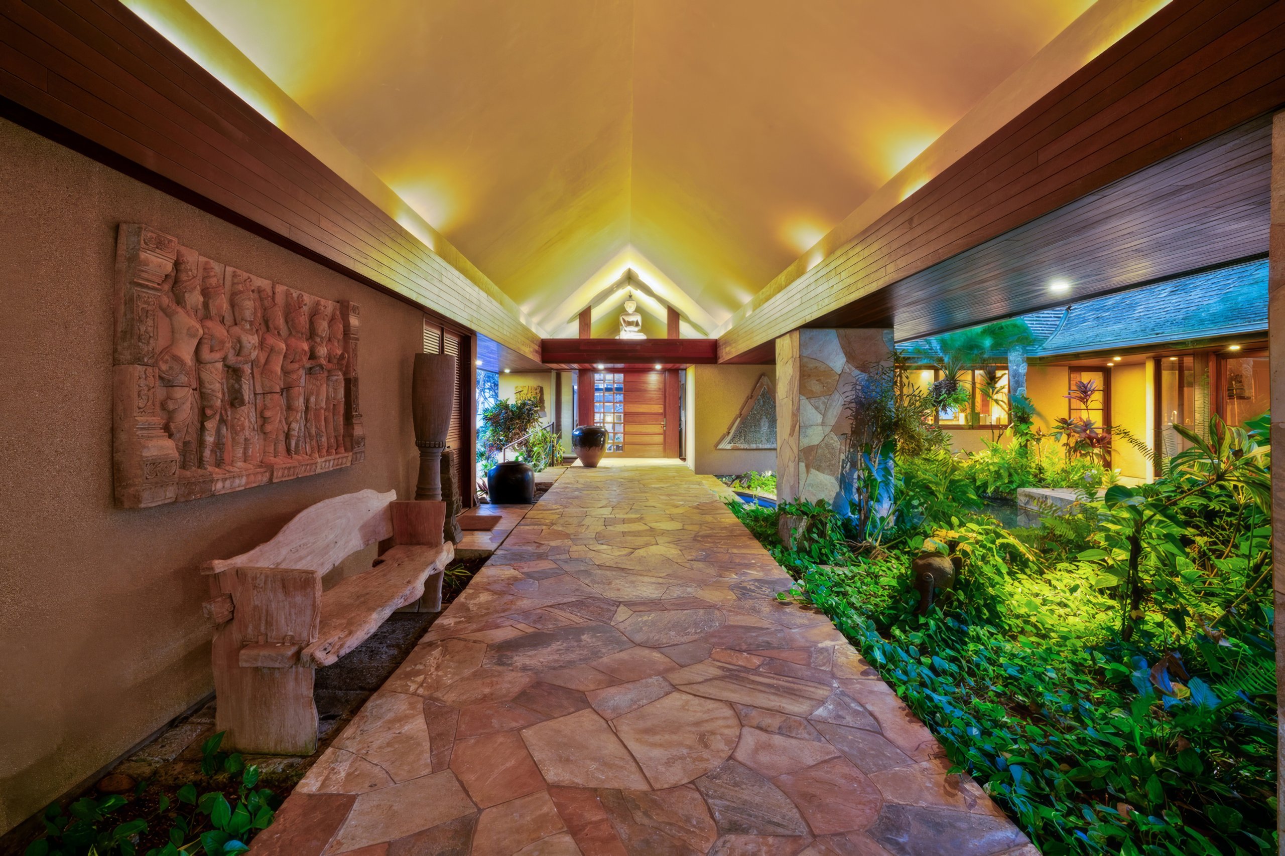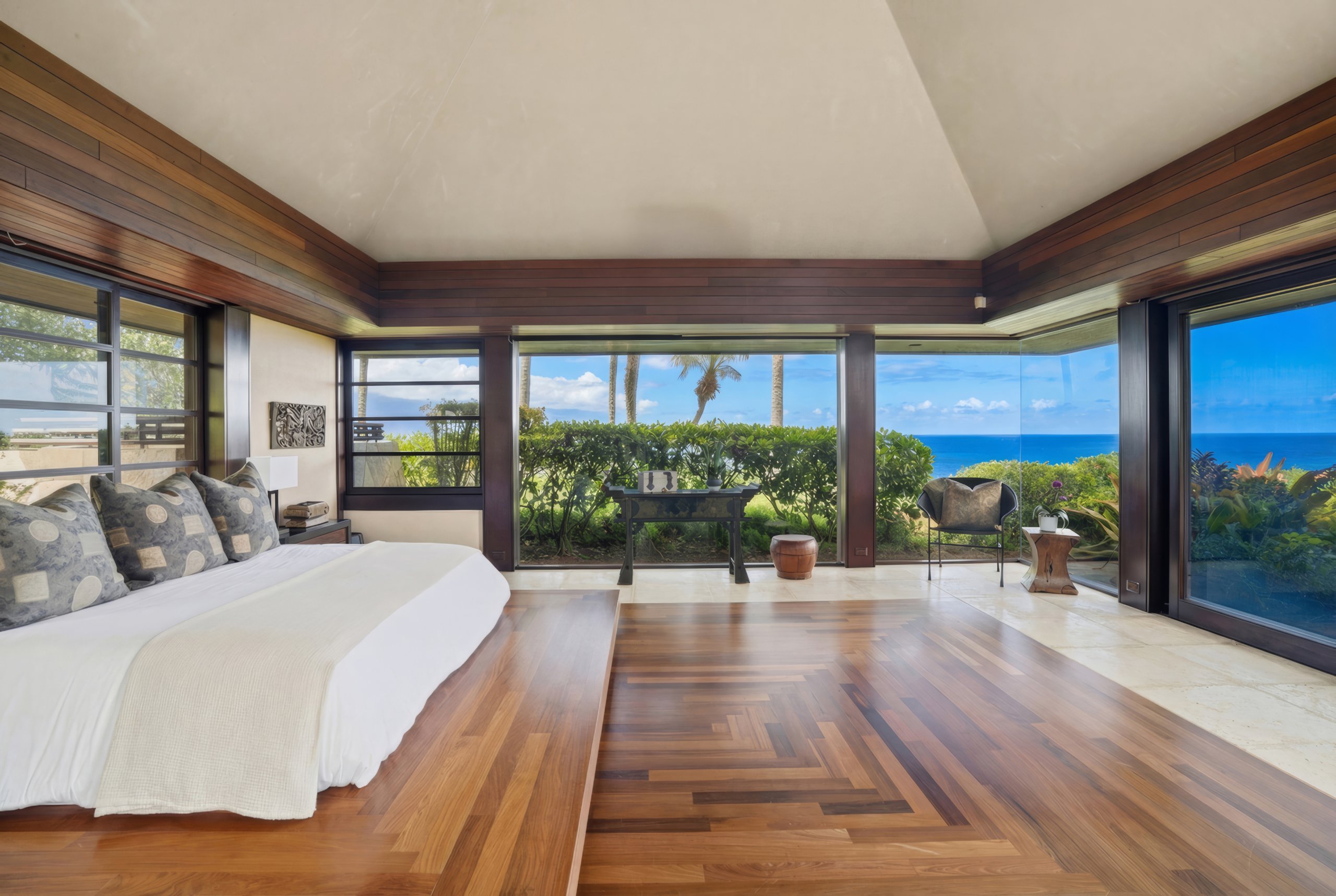 The residence is composed as a series of connected pavilions that follow the natural contours of the bluff. Each structure is positioned to respond to light, wind, and topography, linked by covered walkways and lanais that allow movement across the site without interruption. The buildings sit low within the setting, their rooflines aligned with the terrain so that the architecture recedes rather than dominates. The design reflects a tropical Hawaiian approach shaped by modern principles and adapted to climate and exposure, supported by steel framing and double-wall construction for long-term durability.