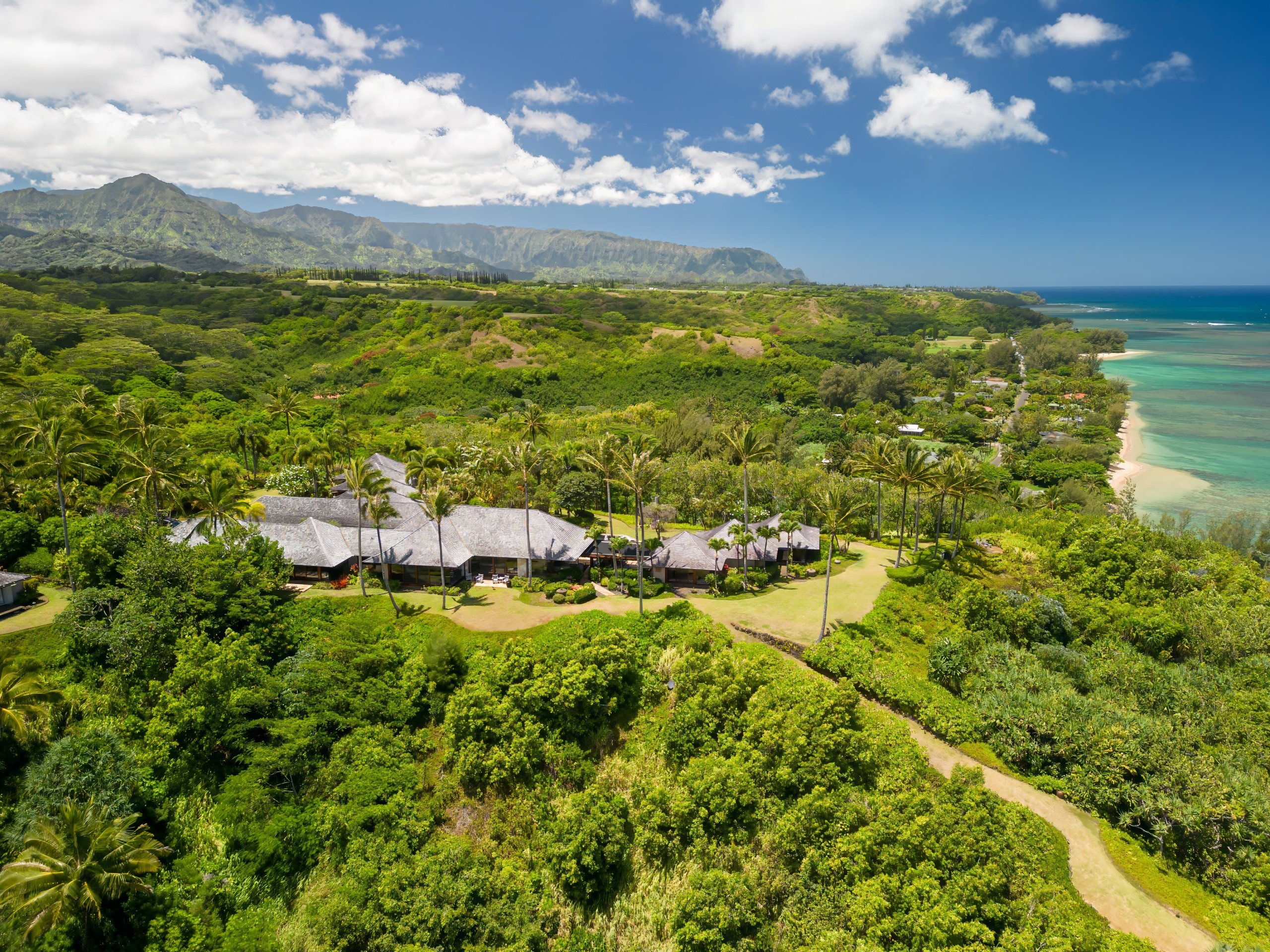 Anini Beach lies below a ridge protected by a reef that runs nearly two miles along the shoreline. Beneath the bluff, that reef shelters a lagoon of clear turquoise water over coral and white sand. Above it, the terrain rises to a vantage where the shoreline extends east toward Kīlauea Lighthouse and west toward Kalihiwai Bay. The property spans 6.87 acres along this ridge, located at the end of a gated cul-de-sac where the road ends and the property continues. Its character becomes clear over time, through planting, spacing, and orientation. You have the reef below, shoreline extending in both directions, with trade winds moving steadily across the elevation.