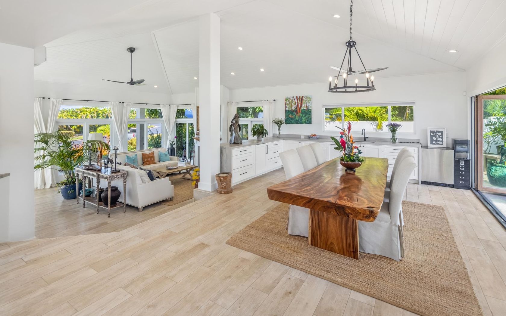 Completely re-envisioned in 2022, the home blends contemporary island aesthetic with warmth and sophistication. The layout features multiple gathering areas for relaxing and hosting, including two separate entertainment spaces. One opens to the pool for laid-back lounging, while the other frames soft sunset colors from the kitchen and main living area.