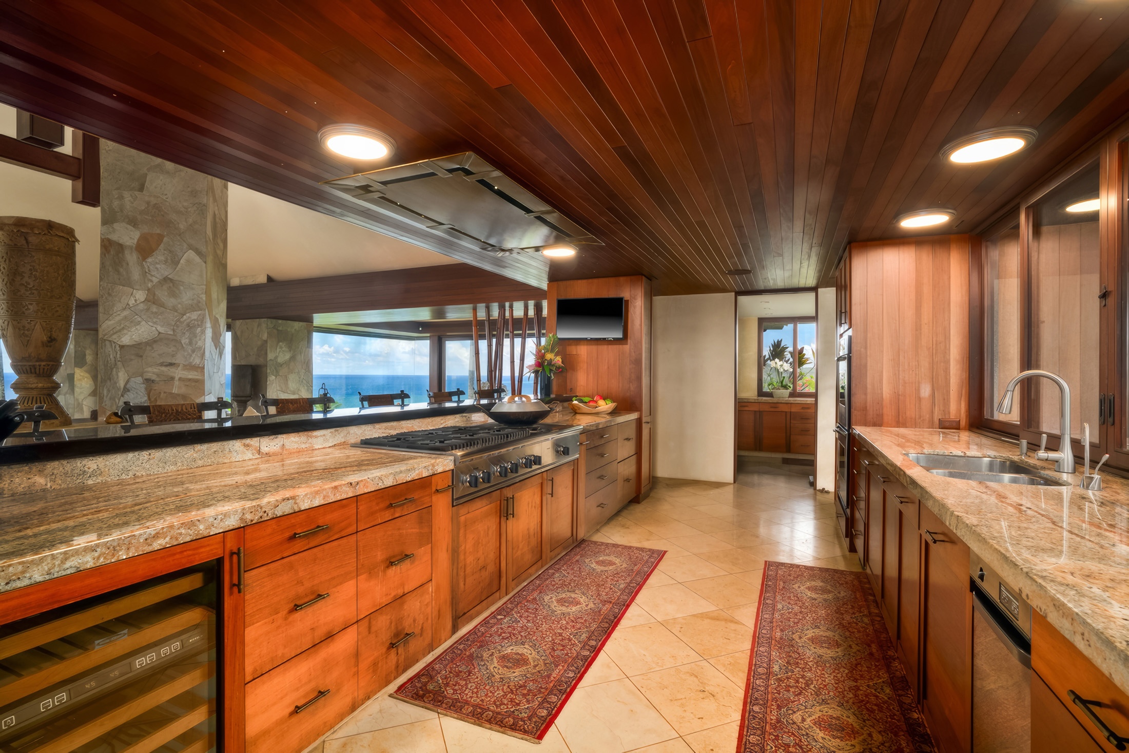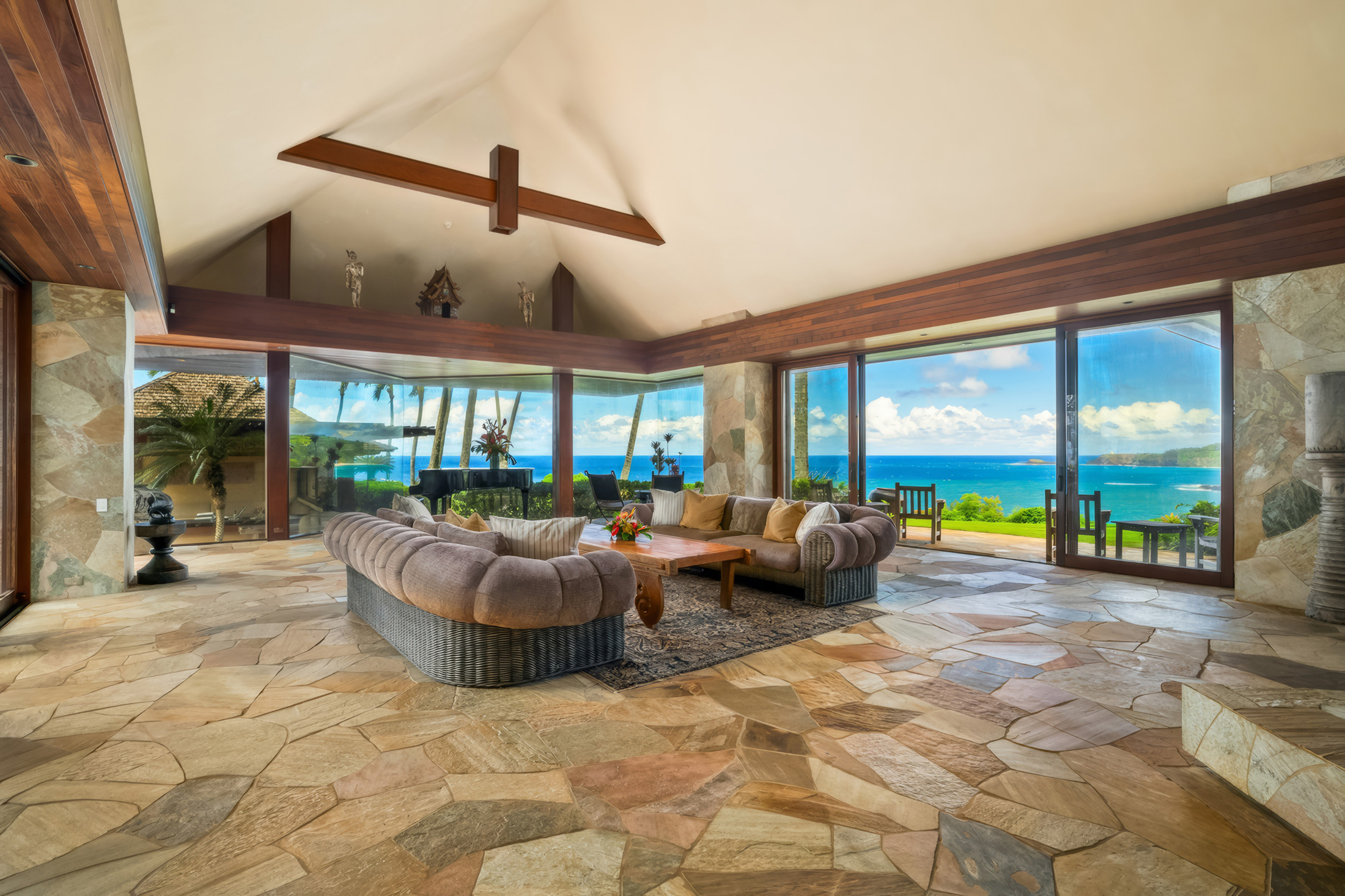 The architecture at 4200 Anini Vista draws from Balinese and Southeast Asian influences, expressed through materials, proportion, and detail. Large-format natural stone floors extend seamlessly from interior rooms into covered transitions, maintaining continuity underfoot. Vaulted wood-beam ceilings define the primary volumes, while carved wood screens and stone detailing appear at entries and along circulation paths. These elements are consistent rather than decorative, contributing to a cohesive material language that becomes more apparent as one moves through the property.
