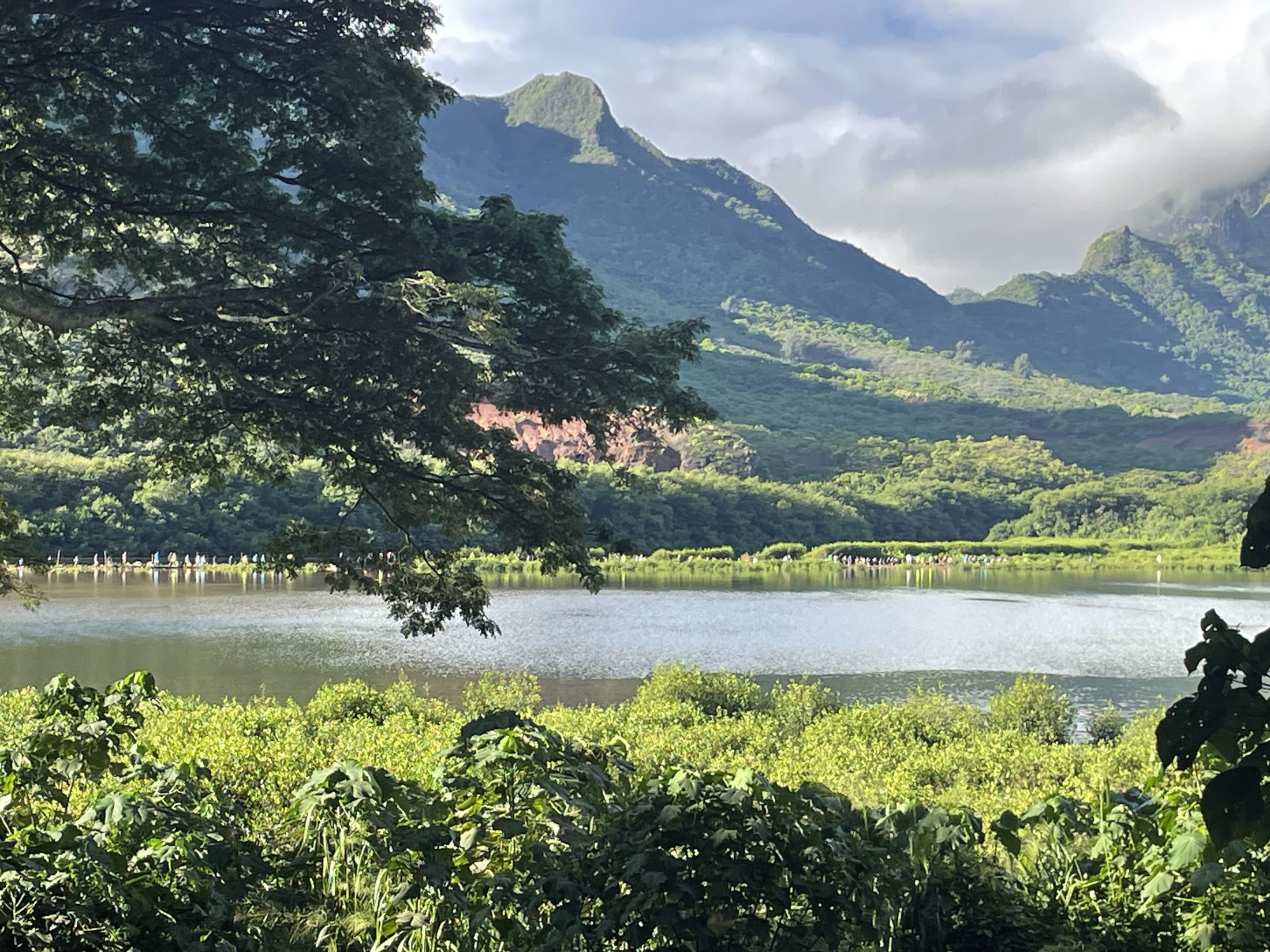 As I explained in this 2023 post about our second volunteer work day, historically along the Hulēʻia River a significant sustainable food system flourished. The river waters fed into taro patches and multiple fishponds, in addition to the fish and shellfish within the river itself. There are at least six types of fishponds developed by Hawaiians. The one at Alakoko is a loko kuapa. This type of pond is near the coast, where sweet water from a stream mixes with salt water from the ocean. Brackish water in the pond supports rich algae growth attracting herbivore fish, and sluices allow huge numbers of immature fish to exit, supporting healthy fish populations in coastal waters and the deep ocean.