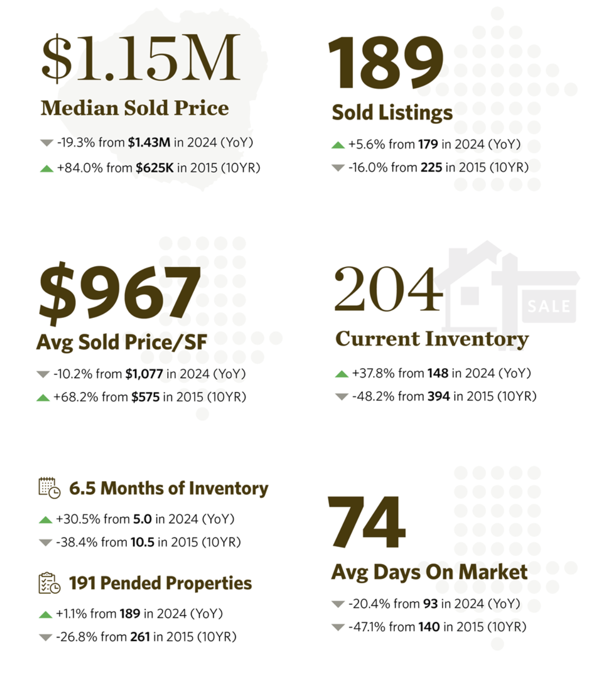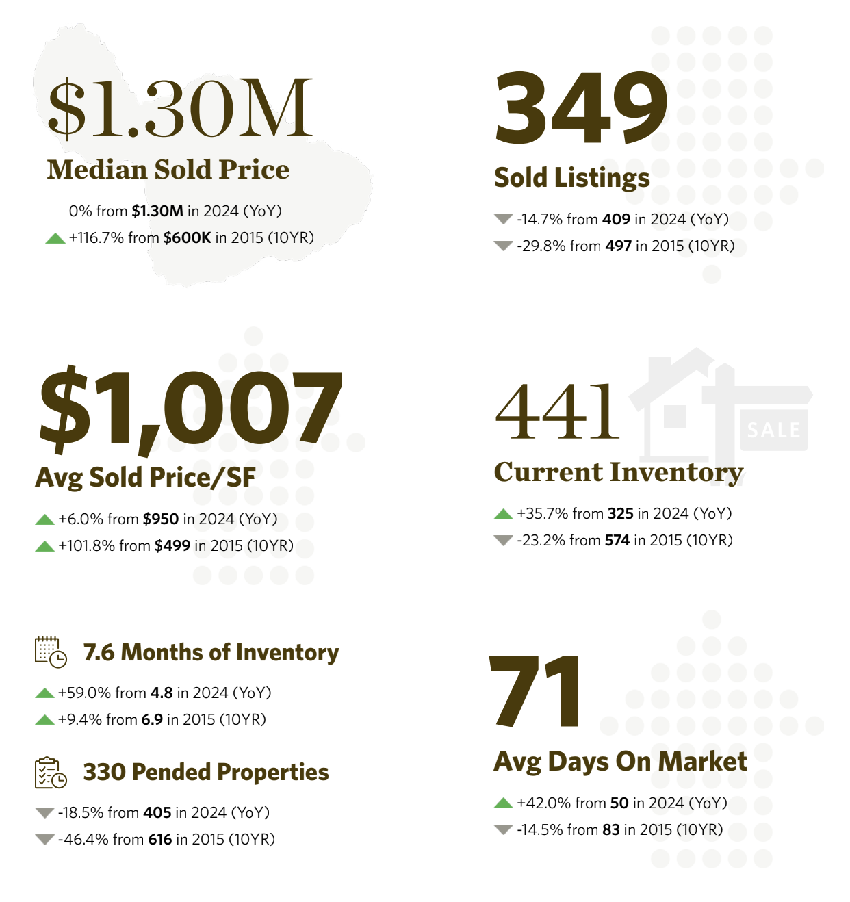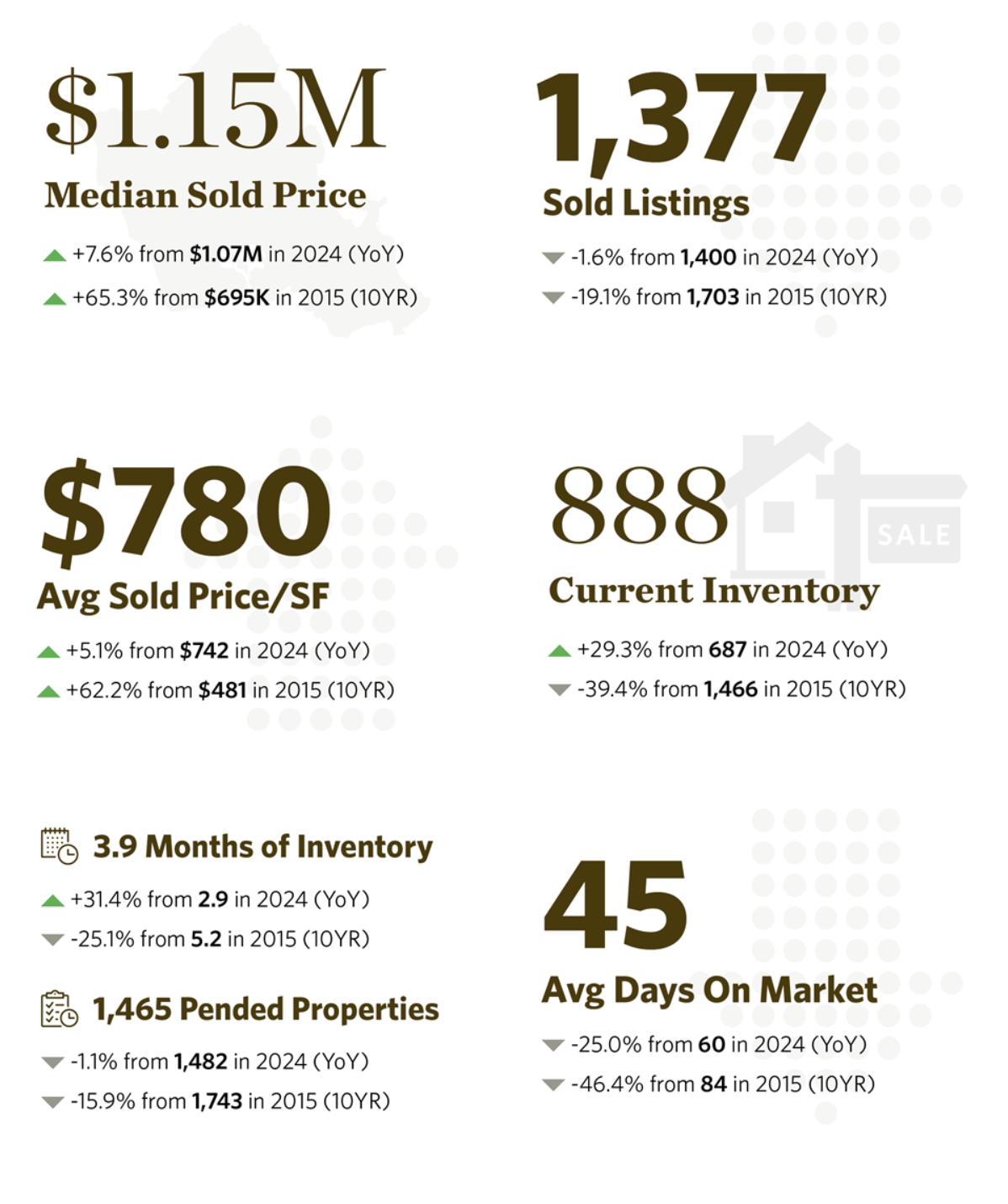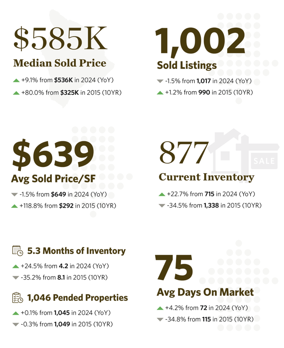 Behind the Numbers: Inventory is up and median sold price grew 9.1% to $585,000 in the first half of 2025. Buyers are more measured, with interest rates and broader economic factors playing a role as the market finds a more balanced pace.