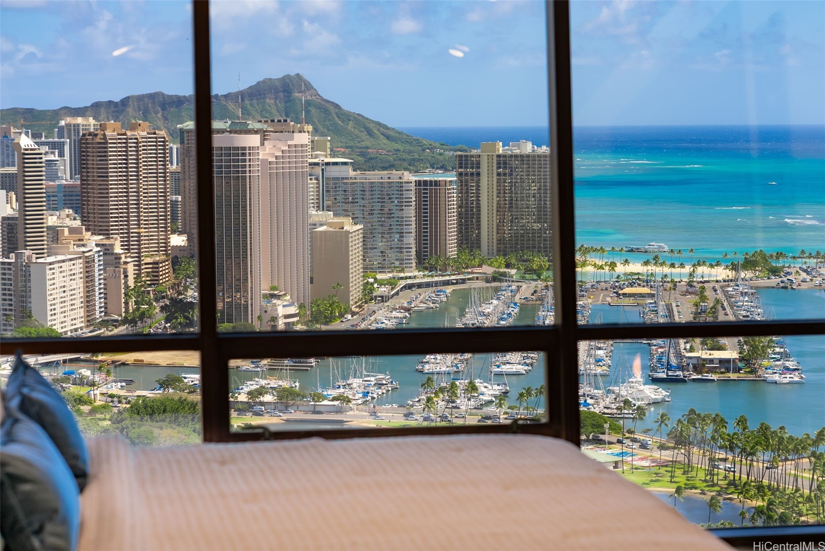 This stunning home offers panoramic views of Magic Island, Ala Moana Beach Park, sunsets over Diamond Head, and the Koolau slopes.