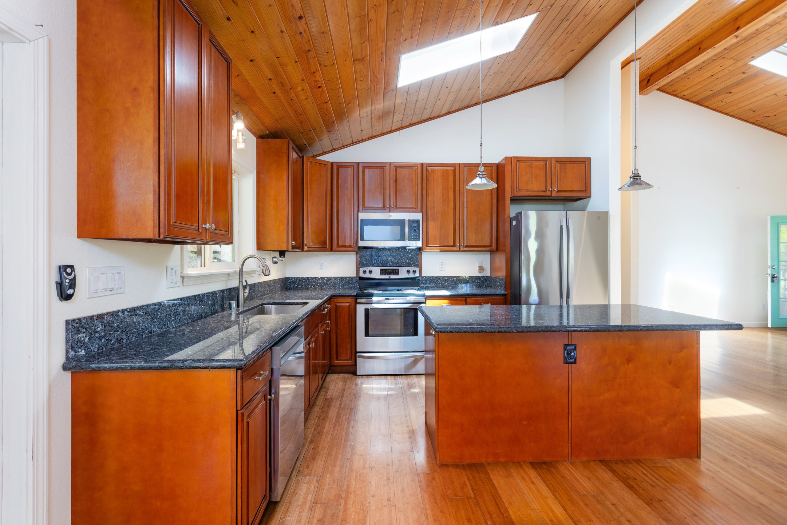 Inside, soaring vaulted pine wood ceilings and French doors create a bright, airy feel. The open-concept layout connects the kitchen to a spacious dining and living area. A split floor plan places the primary suite on one side for privacy, with two additional bedrooms on the other.
