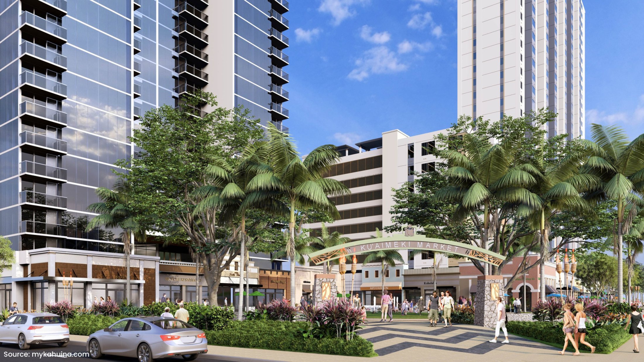 This community is called Kahuina, which includes two towers called Lamakū and Māmalu. There will be ground-floor retail spaces of about 35,000 to 42,000 square feet, and a nine-level parking garage with over 1,200 parking stalls and eight EV charging stations to support both residential and commercial uses.