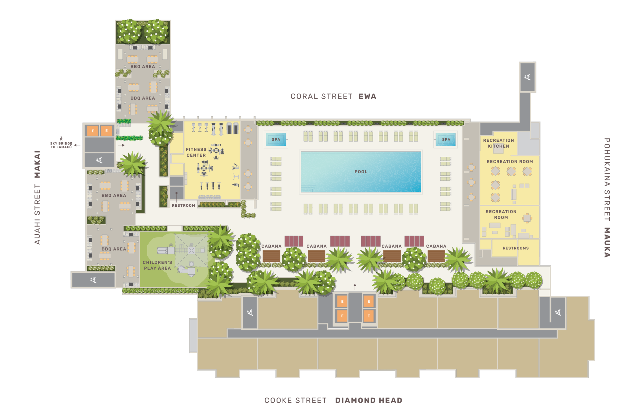 Here is the sixth-floor amenity deck floor plan of Kali‘u. The red area is the residential tower and it’s located sort of in the center of the block. On Kali‘u’s sixth-floor amenity deck, a pool is on Coral Street and a pickleball court is on Cooke Street highlighted in green.