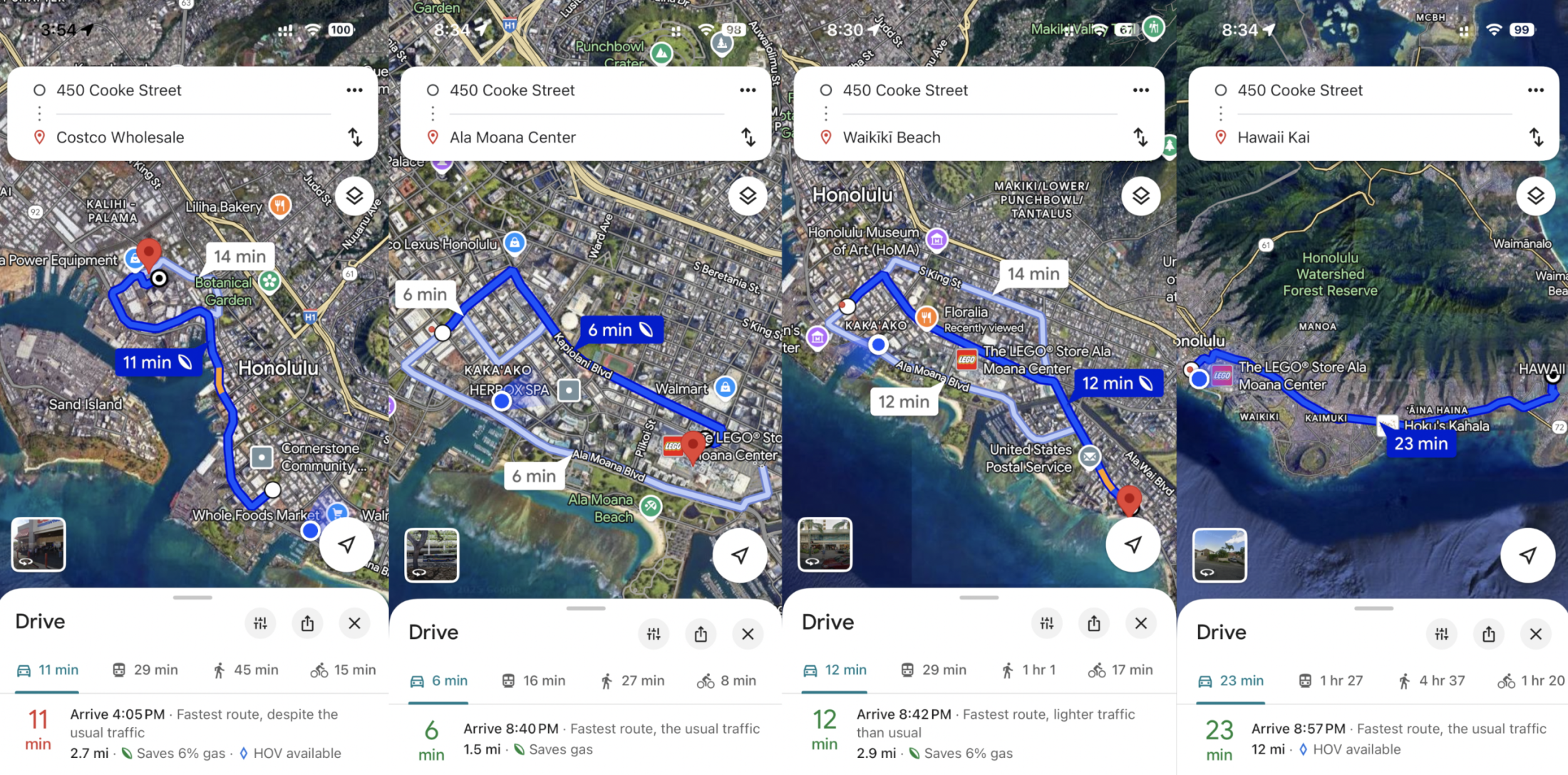 These are screenshots of Google Maps when I put Kahuina’s street address, to show you how easy it is to get around. You can see the time I took the screenshot, the exact distances in miles, and the time it takes depending on how you travel.