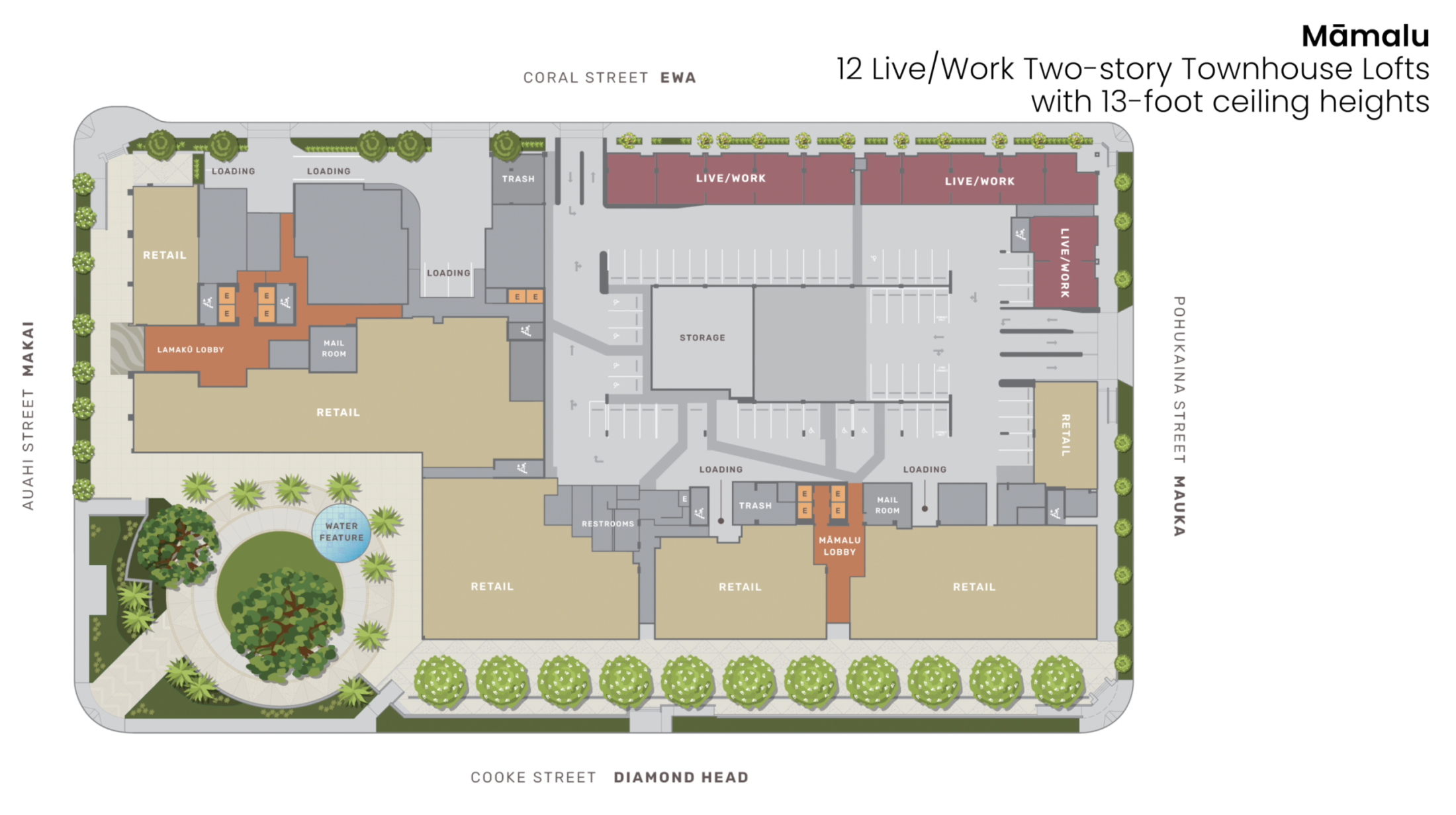 Also, at street level, at the corner of Pohukaina and Coral Street, there are 12 live/work units that are two-story townhouse lofts with 13-foot ceiling heights, which are for people who want to combine residential living with their business operations and leverage the booming traffic in the area.