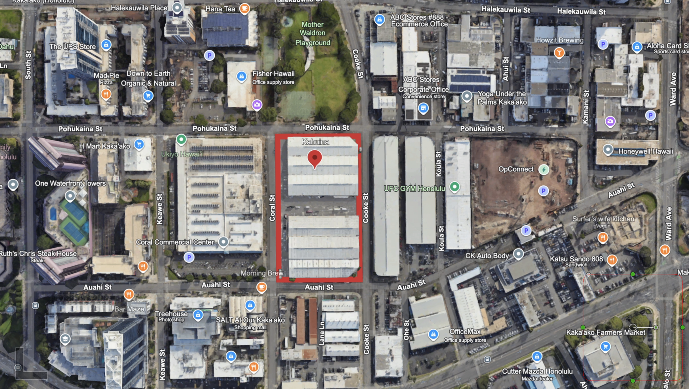The address of the Kahuina project is 450 Cooke Street, Honolulu HI 96813. It is situated on a full-block site fronting Mother Waldron Neighborhood Park, bordered by Pohukaina Street on the mauka side ( meaning toward the mountain side), Cooke Street on the Diamond Head side, Coral Street on the ʻewa side, and Auahi Street on the makai side meaning toward the ocean side.
