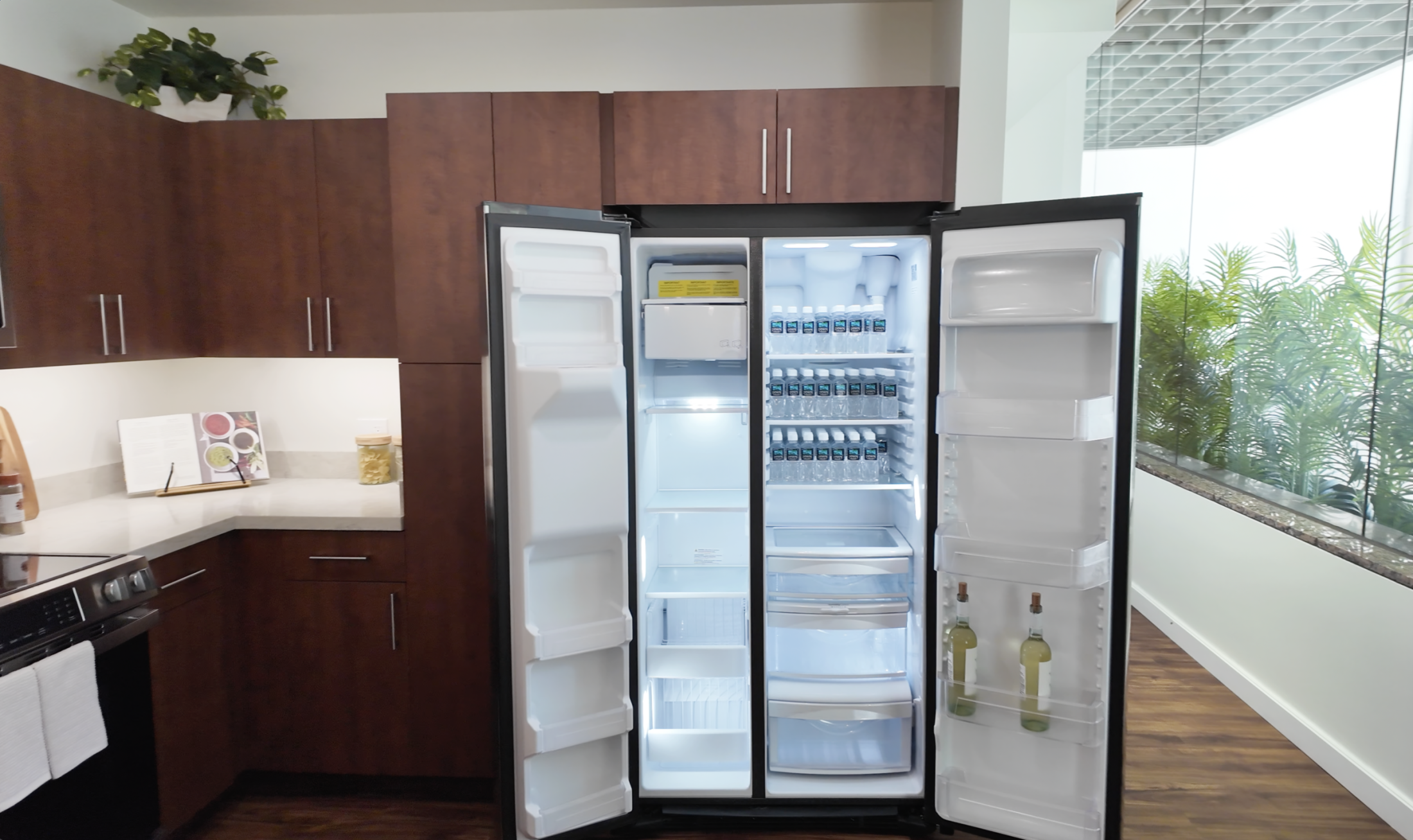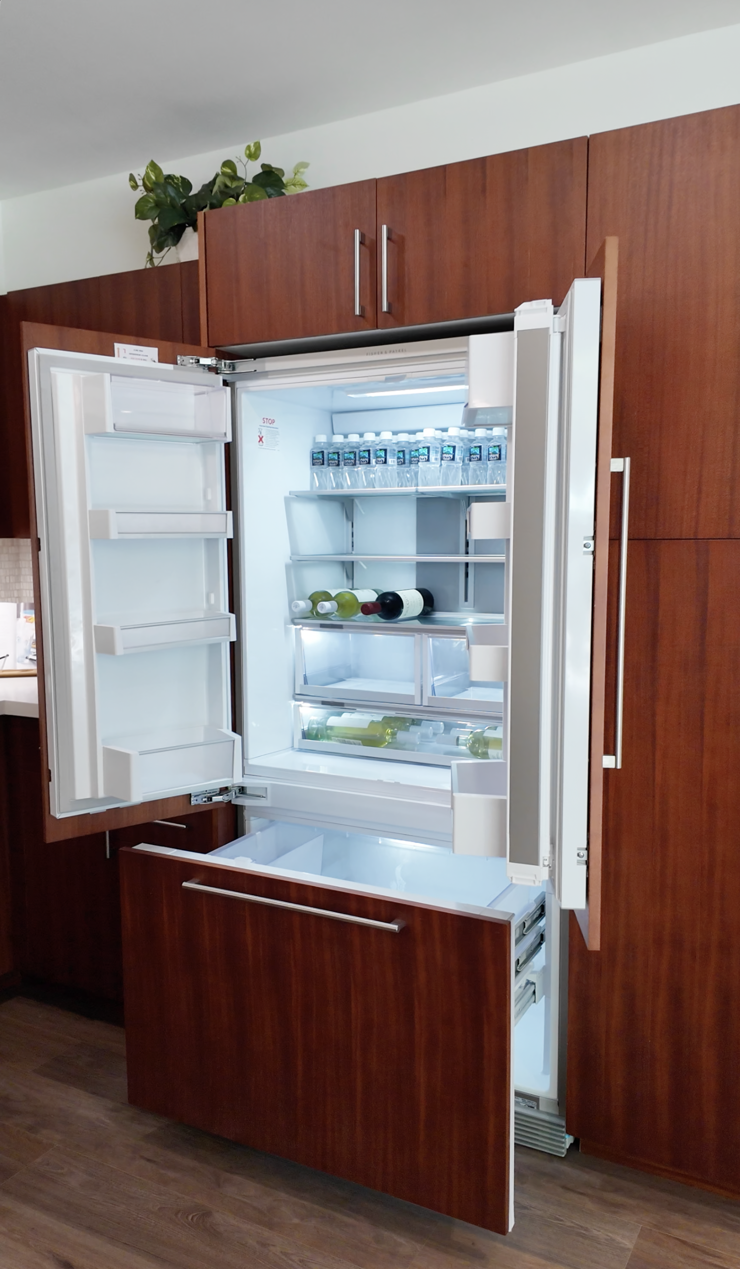 Here is a close-up of the fridge, which comes with ample storage. The freezer is below, divided with two drawers that you can slide out.
