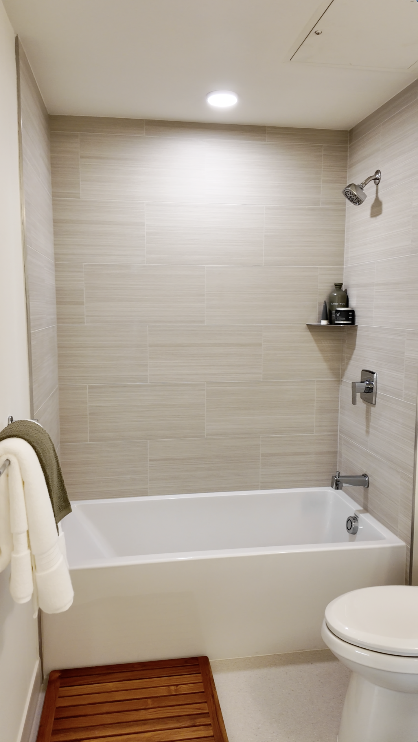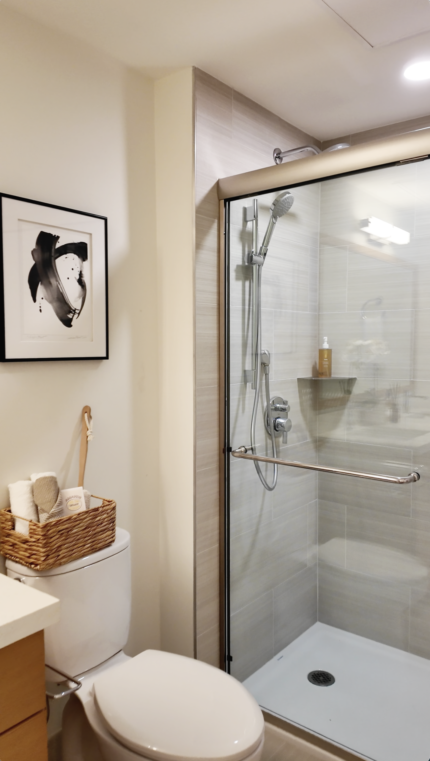 The bathroom features light, modern finishes and a sliding-glass shower with both a rain head and an adjustable handheld shower.