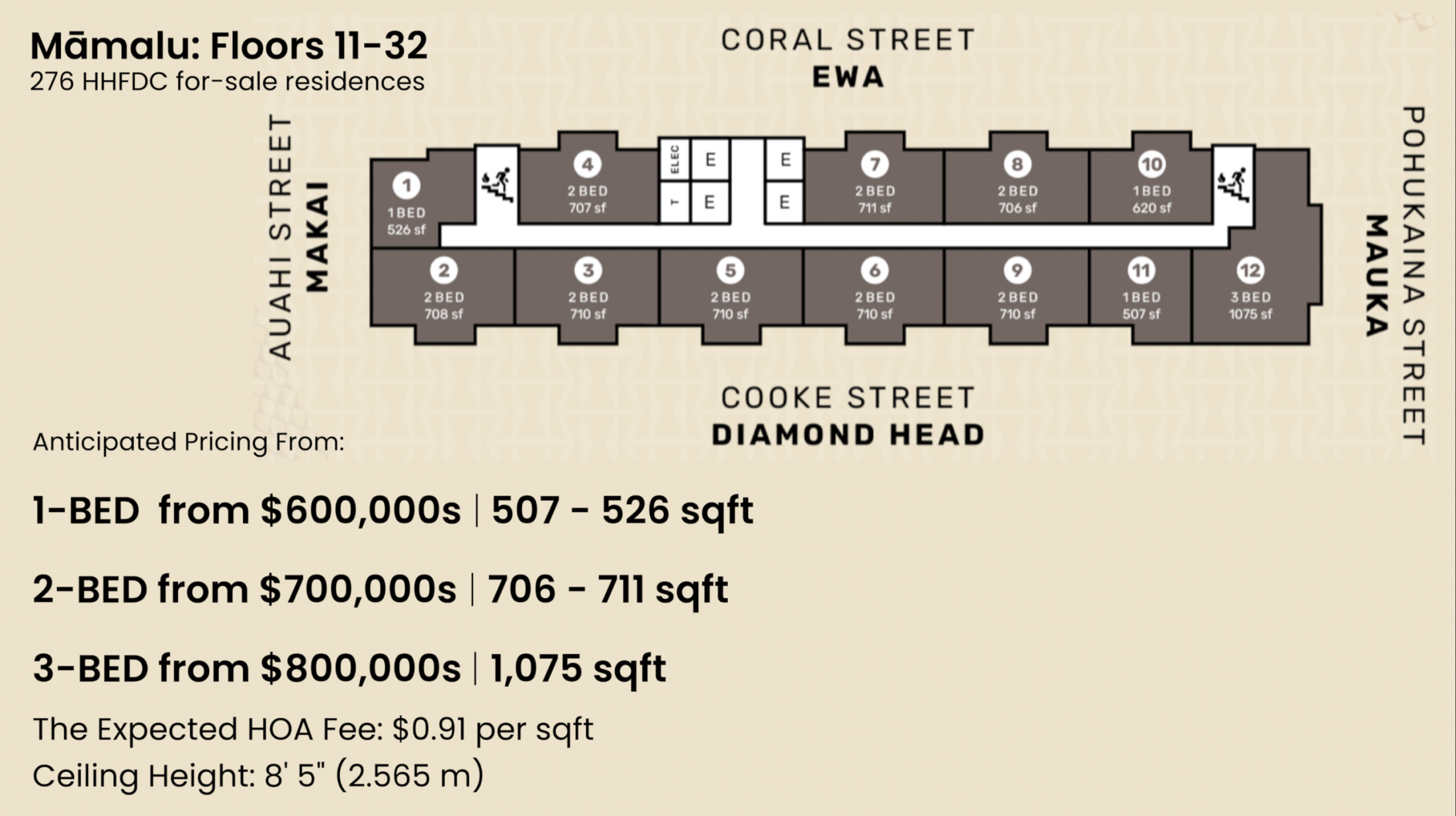 Now let’s look at Māmalu’s 11th- to 32nd-floor plan. There are 276 HHFDC for-sale residences with a ceiling height of 8 feet 6 inches tall.