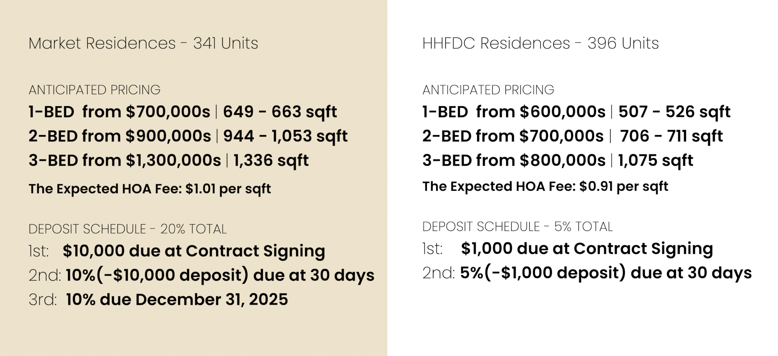 For Market Residences, the deposit schedule is 20% total — that’s $10,000 due at contract signing, another 10% (minus the $10,000 deposit) within 30 days, and the final 10% due by December 31, 2025. The rest is due when it’s built.