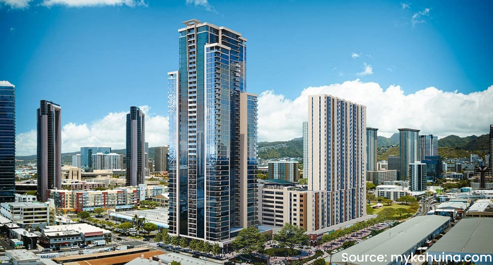 Note that both Kali‘u and Lamakū buildings are 400 feet tall, reaching the maximum height allowed for the block.