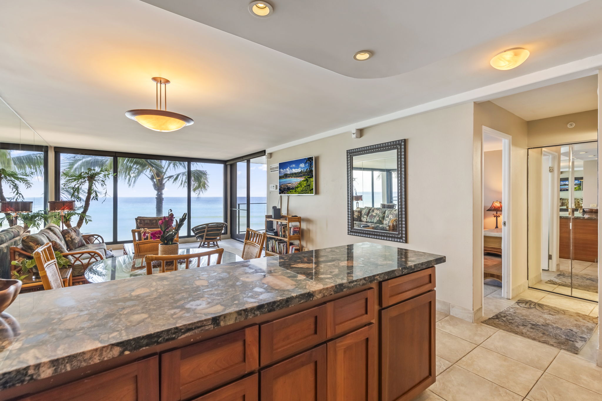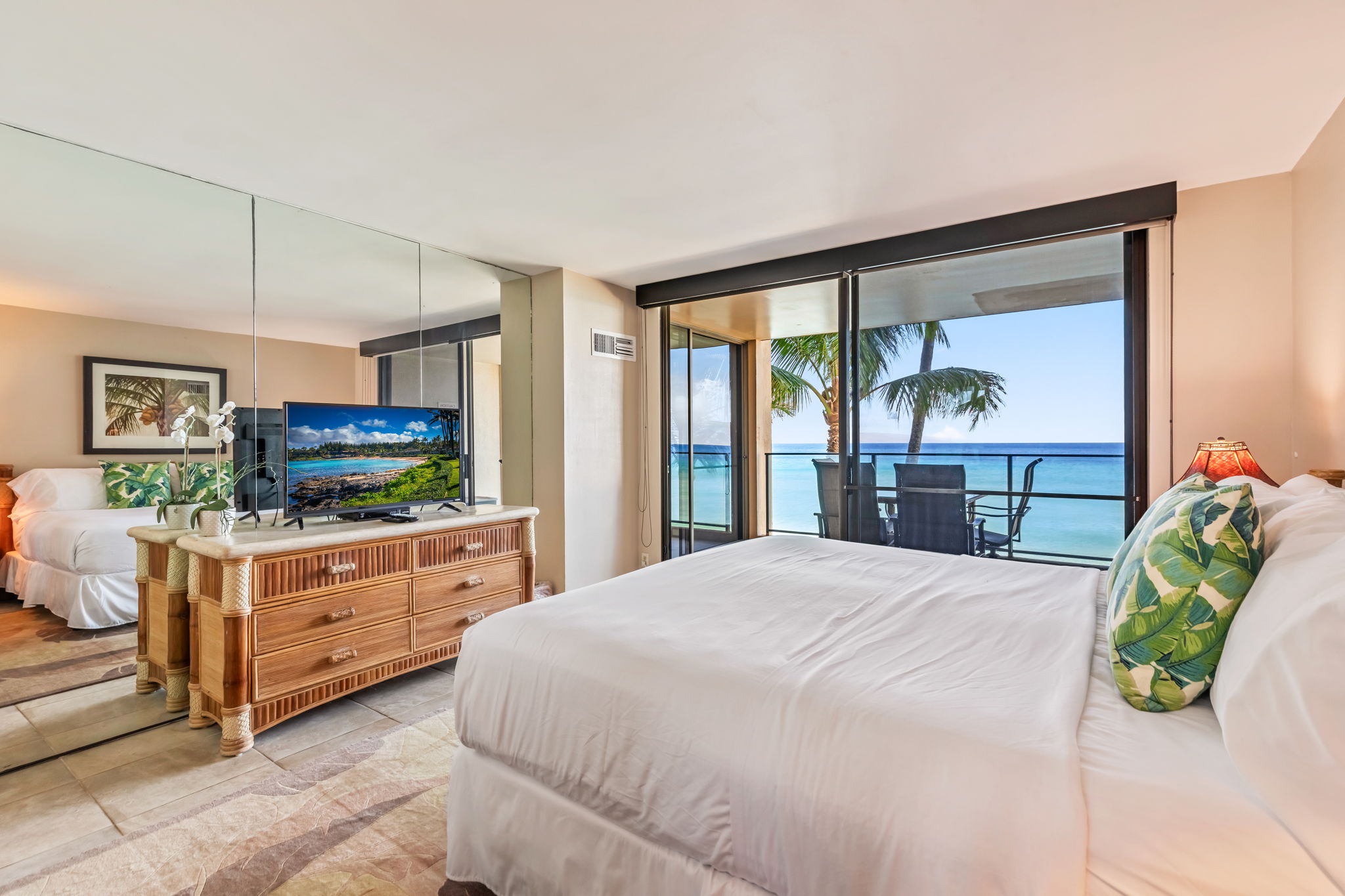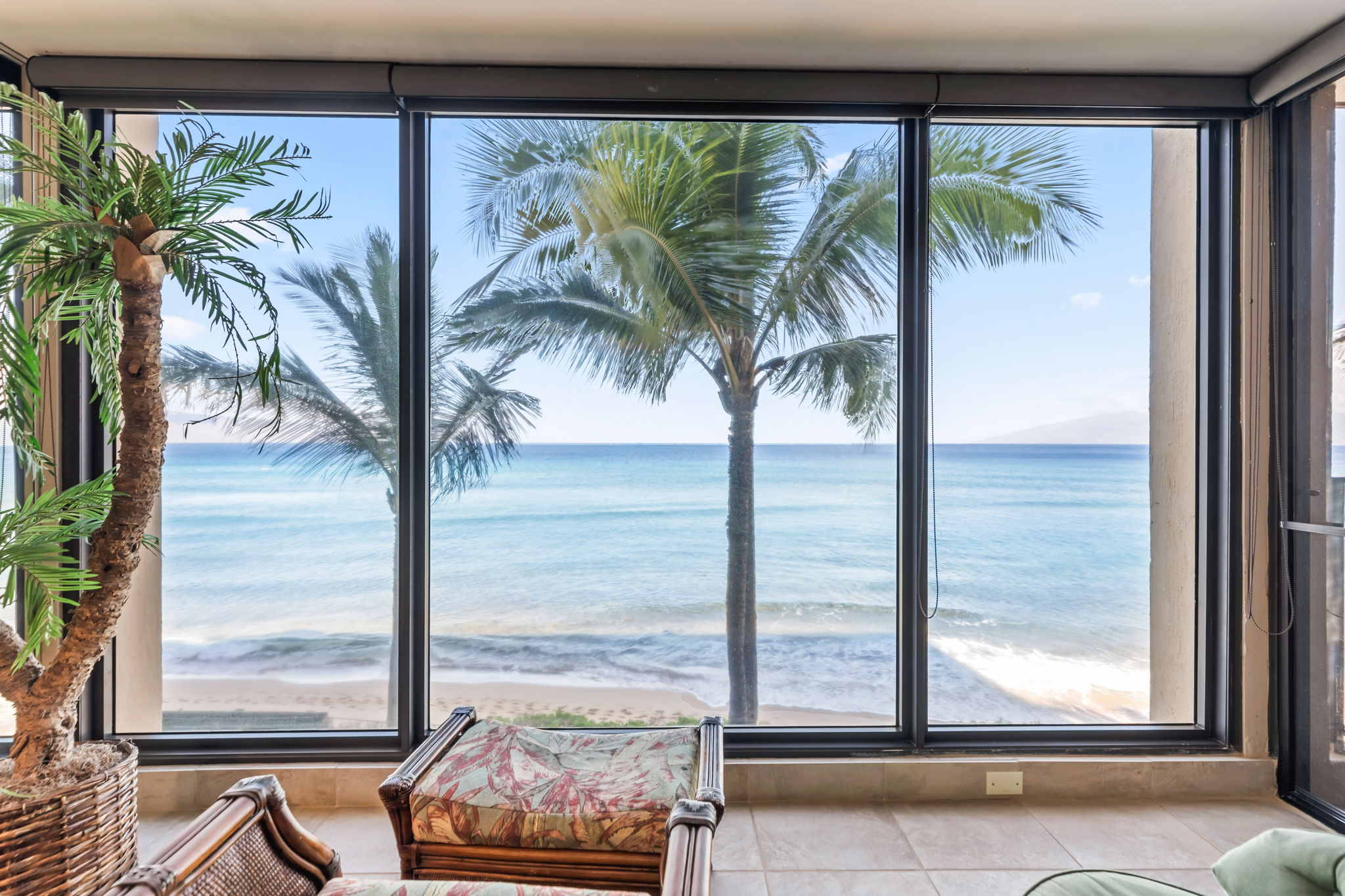 What truly sets Mahana 308 apart are the floor-to-ceiling glass windows that span the entire ocean-facing side of the condo. From the moment you step inside, the sparkling blue water and the neighboring islands of Moloka‘i and Lana‘i seem close enough to touch. Watch sea turtles glide by, whales breach in the winter months, and enjoy unforgettable sunsets—all from the comfort of your living room, your bedroom or the privacy of your lanai.