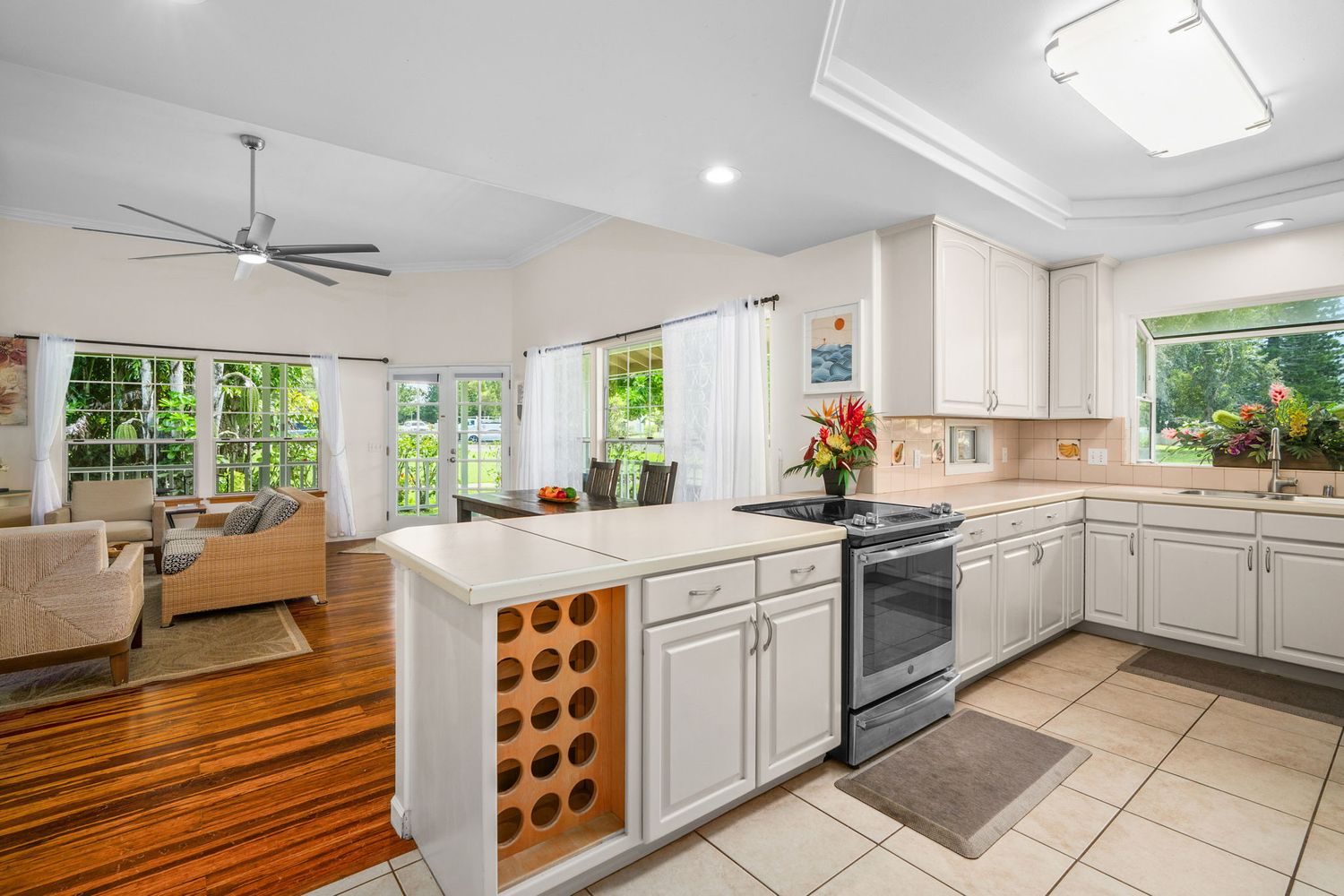 The open-concept layout features high ceilings and expansive windows that fill the home with natural light, refreshing tradewinds, and views of the lush tropical landscape.