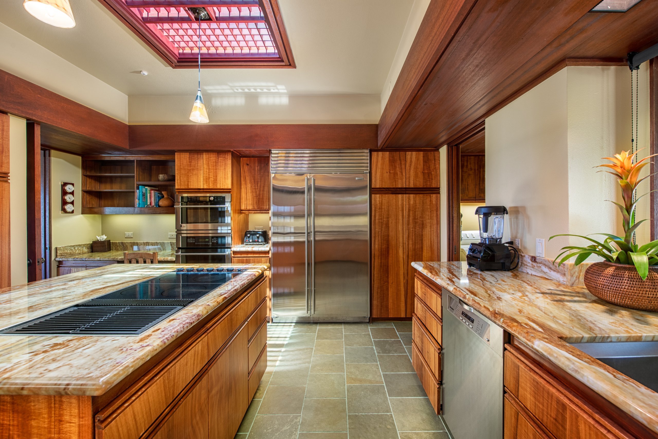 The home is crafted with rich mahogany wood accents, upgraded countertops, and slate floors. An expanded pool with a hot tub and newer pool deck enhances the outdoor living space. The sunken living room embraces breathtaking ocean views and overlooks the private swimming pool, creating a seamless indoor-outdoor connection.