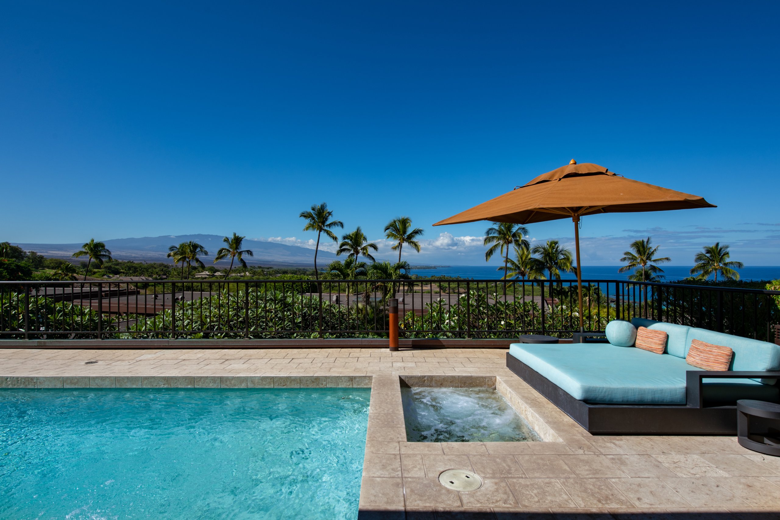 This upgraded villa is located at the highest point in the project, offering sweeping views of the ocean, bay whitewater, the Kona-Kohala coastline, year-round sunsets, golf, and the surrounding volcanoes. Its elevated position captures expansive vistas from nearly every angle.
