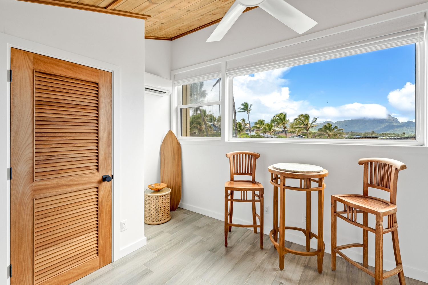 Each room includes split air conditioning, with the option to open the Fleetwood slider in the living area and upgraded Milgard windows in the bedrooms to enjoy tradewinds and ocean sounds throughout the tri-level layout.