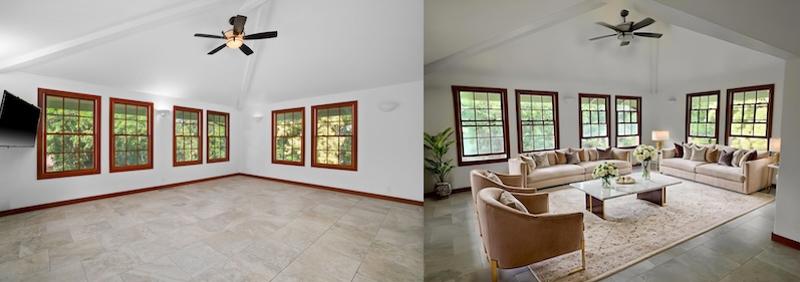 If you’re looking to buy a home on Kauai and you’ve been browsing homes online recently, you may have noticed photos where an empty room suddenly appears beautifully furnished — complete with sofas, rugs, artwork, and décor. In many cases, those furnishings aren’t physically in the home at all. Instead, they’ve been digitally added using AI or virtual staging software.