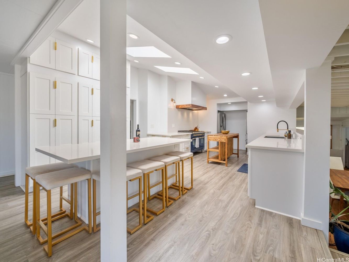 Inside, a vaulted-ceiling chef’s kitchen stuns with skylights, an ILVE 6-burner gas/convection range, dual full-size fridges, and seamless flow for gathering.
