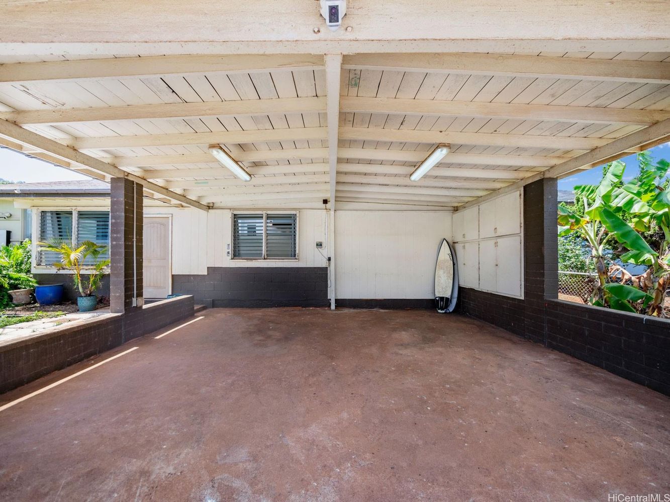 Mature banana, coconut, and papaya trees surround the home, while the split-level layout offers flexibility—downstairs bedroom and bath have separate entry potential for an income-producing studio or guest suite with minimal investment.